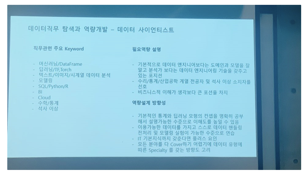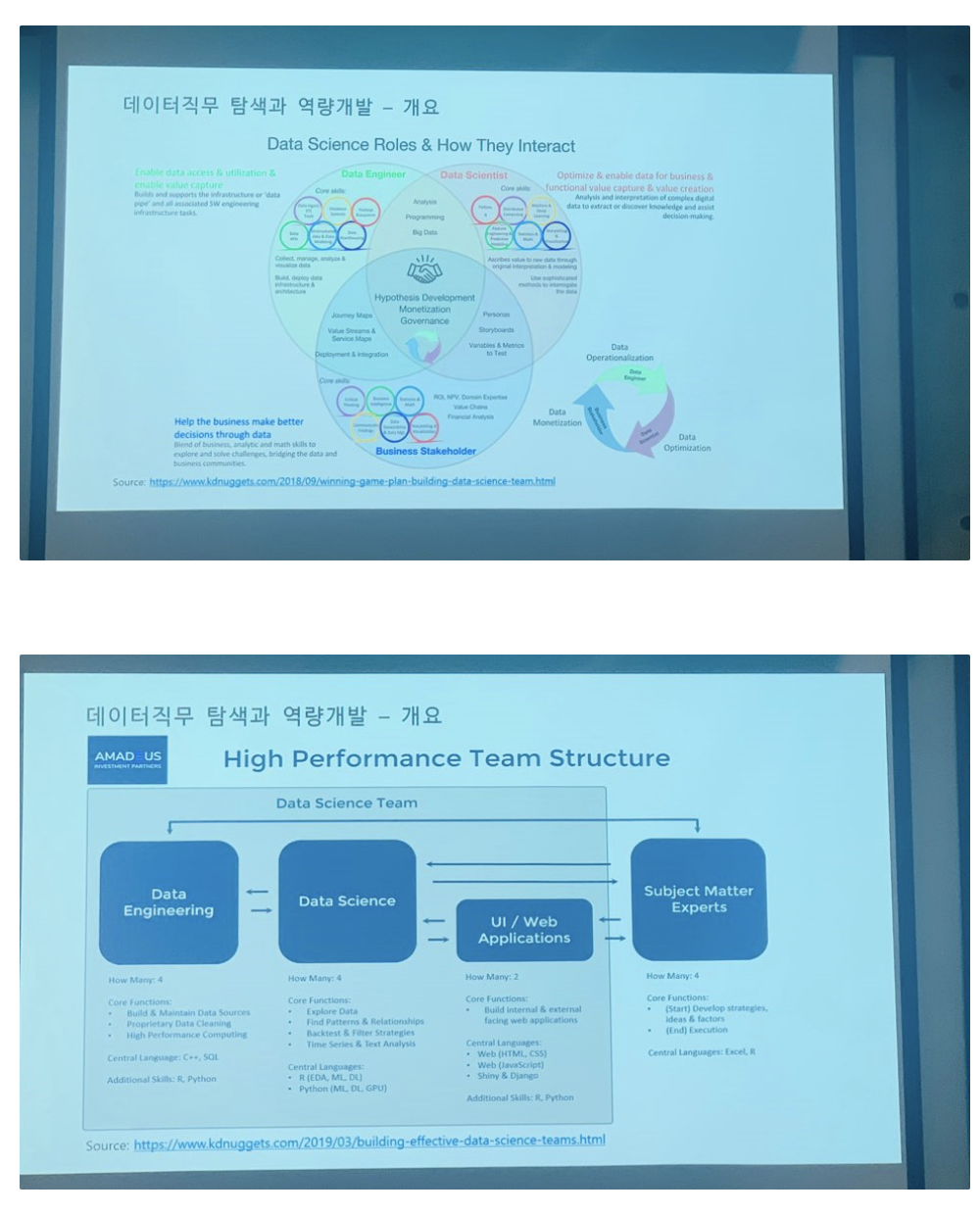 - 국내에서는 데이터 엔지니어 -> 데이터 사이언티스트 -> 데이터 분석가의 단계로 점차 커리어를 바꾸게 뽑고 있는 추세일까요? 데이터 엔지니어, 데이터 분석가 정도로 구분되고 ML engineer로 나뉜다.