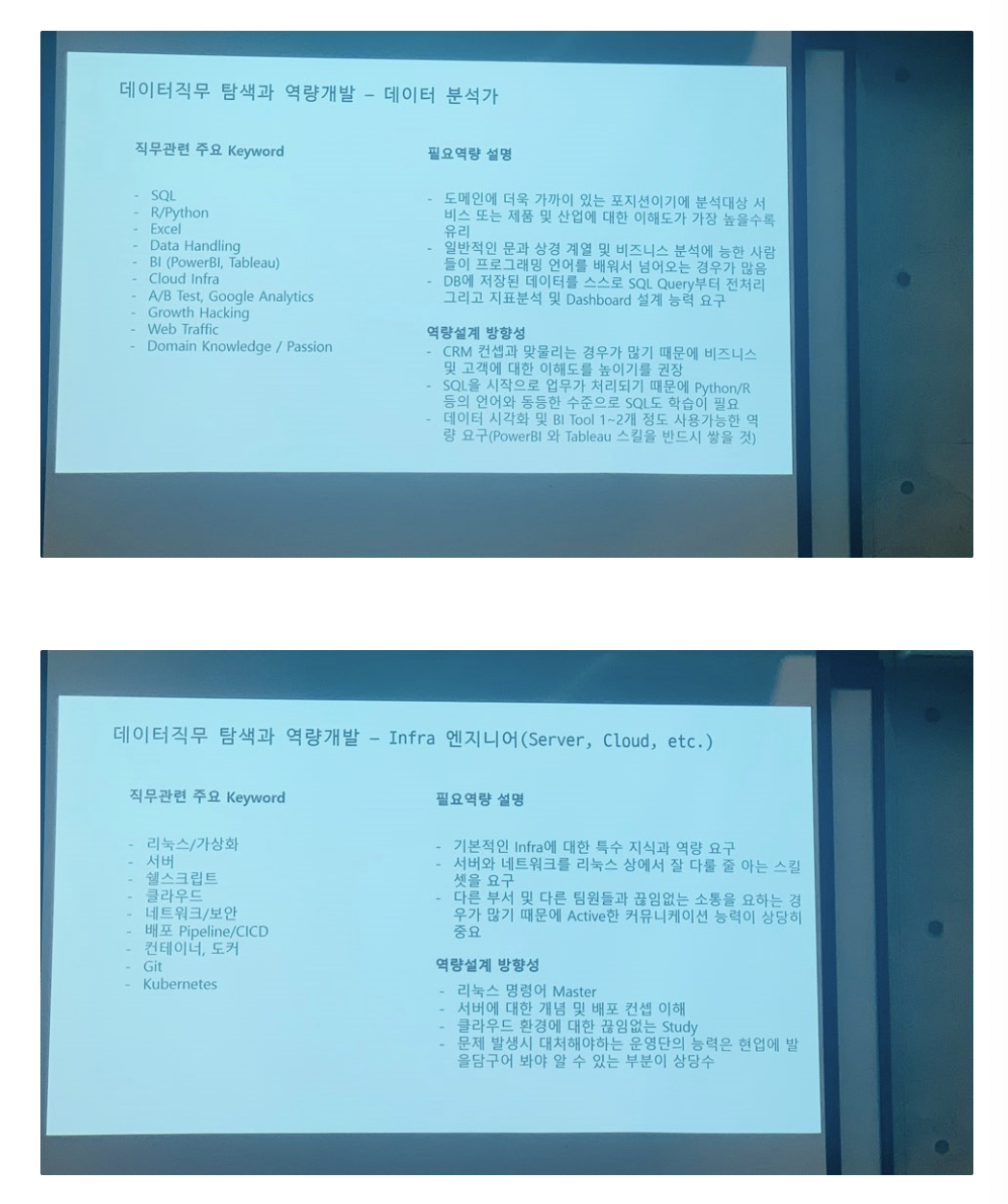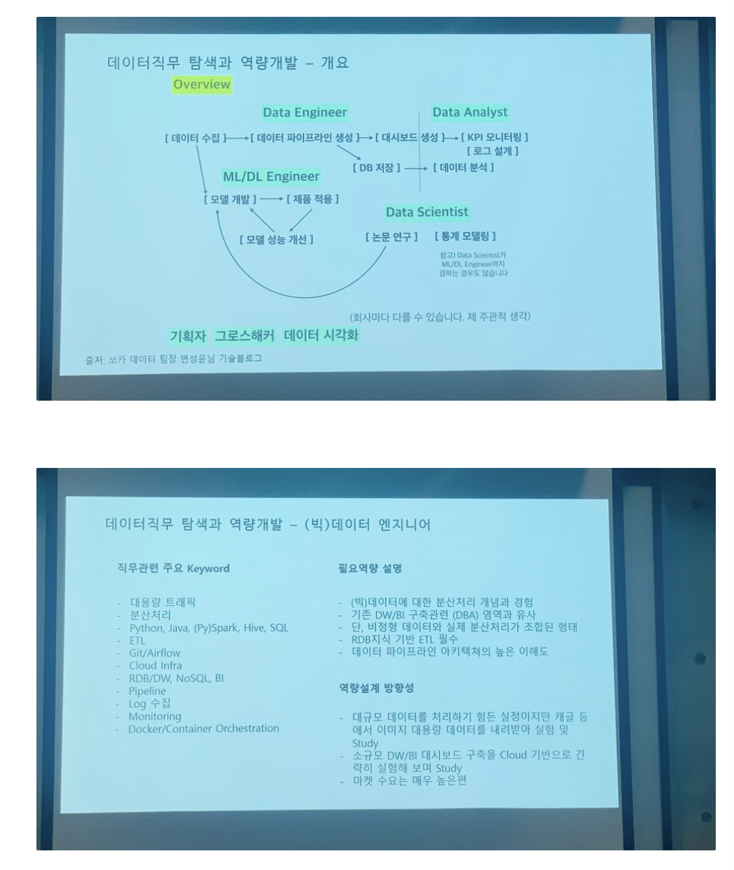 - 국내에서는 데이터 엔지니어 -> 데이터 사이언티스트 -> 데이터 분석가의 단계로 점차 커리어를 바꾸게 뽑고 있는 추세일까요? 데이터 엔지니어, 데이터 분석가 정도로 구분되고 ML engineer로 나뉜다.