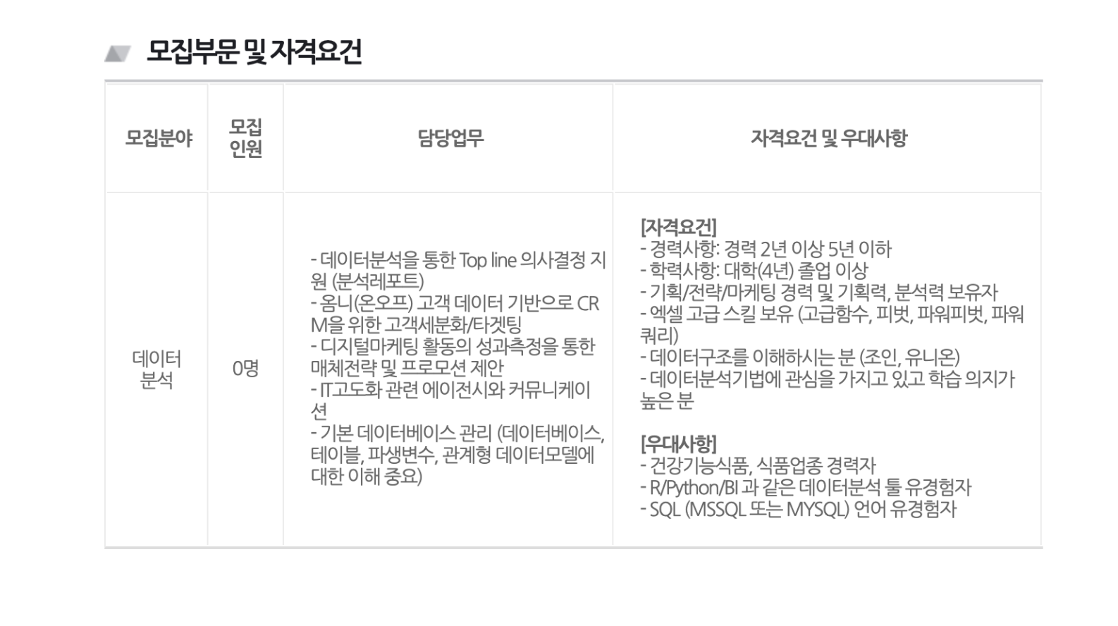 기획/전략/마케팅 경력 및 기획력, 분석력 보유자 엑셀 고급 스킬 → 매우 중요하다 건강기능 식품, 식품 업종 경력자