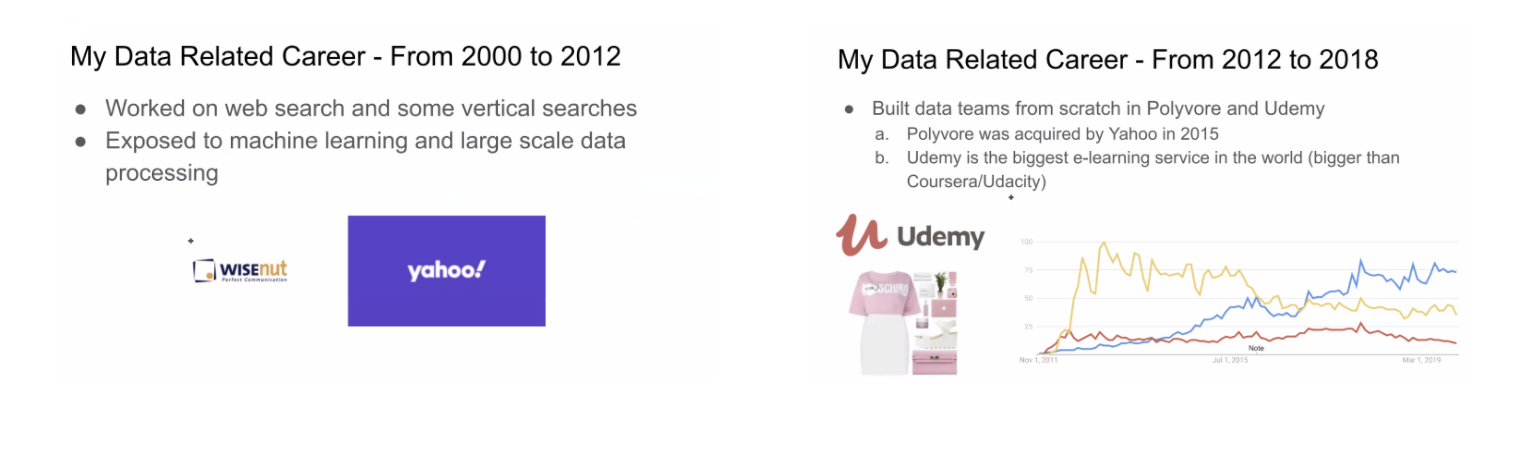 2012년 이후 작은 스타트업 → 데이터팀 설립, 데이터 인프라 구축, 데이터 분석 수행, 데이터 트레이닛 셋 기반 데이터 모델링,
