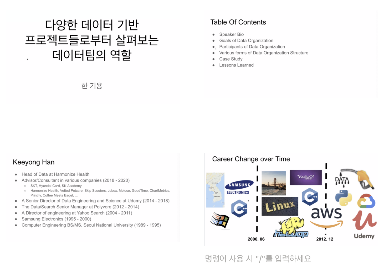 강연 매우 잘들었습니다. 데이터 관련 특강을 못해도 10개이상은 들었는데,이렇게 자세하게 알려주시고, 본인의 경험을 이렇게 공유해주면서 케이스 스터디로 보여주셔서 더더욱 감사드립니다.