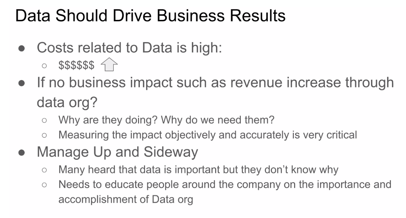 회사마다 데이터 자체로 버는 것도 있지만 (이경우는 레버리지 아님), 아닌 것도 있다. → 데이터를 가지고 돈을 번다는 것을 증명하지 못한다면 데이터팀을 종속시킬 수 없다.