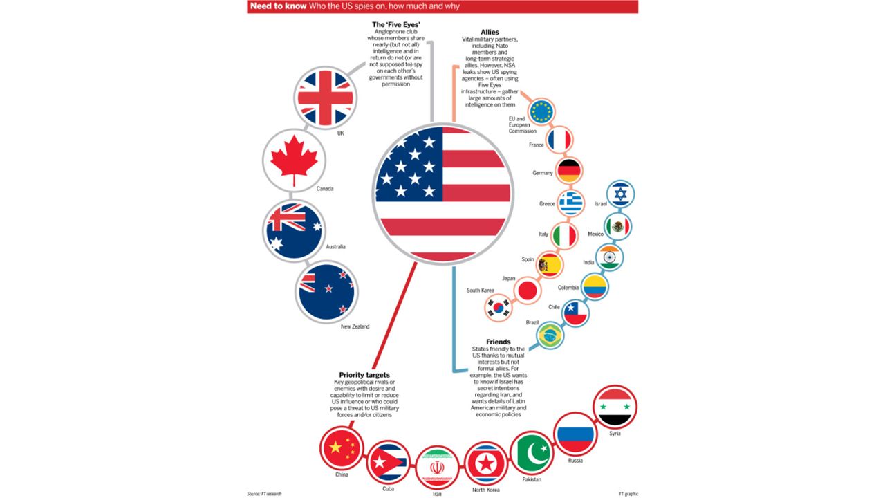 미국 왼쪽의 4개국은 본 문서에서 설명할 5개의 눈(five eyes) 국가들, 미국 오른쪽에 있는 국가들은 이른바 1.5~2급 동맹국들, 그 옆의 국가들은 옵저버급 국가들 마지막으로 맨 아래의 국가들은 적성국들이다.