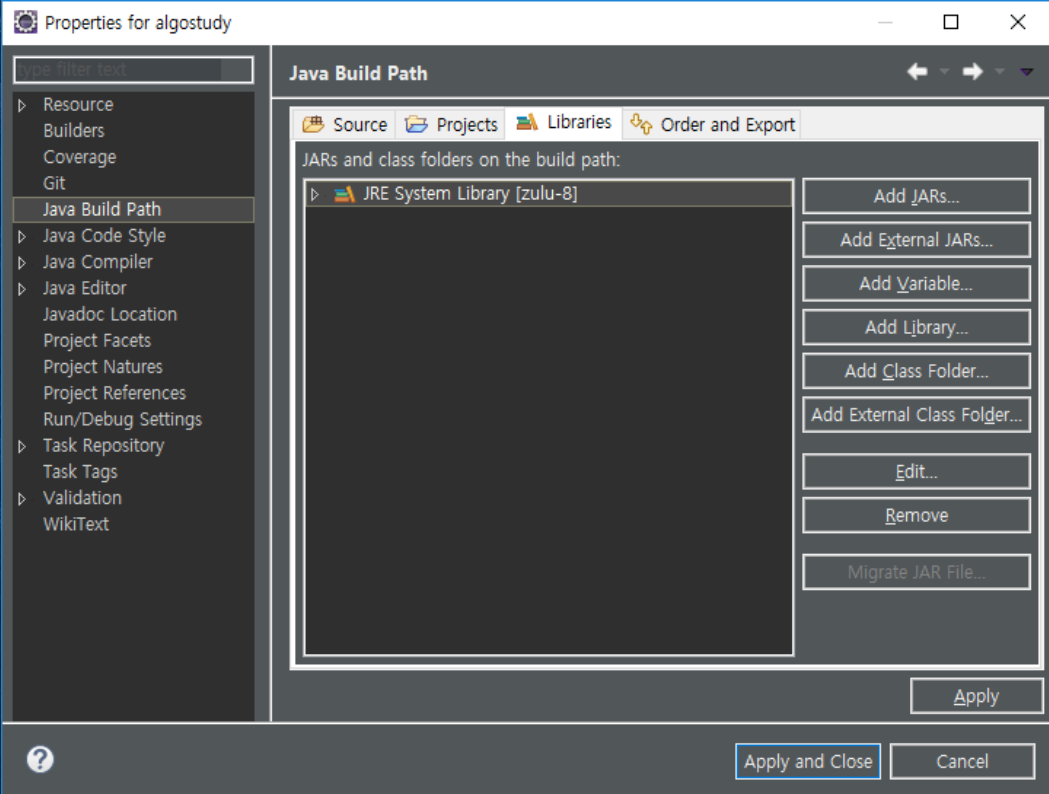 다를 경우 Remove 후 Add Library 혹은 Edit을 클릭한 뒤, JRE를 변경해준다.