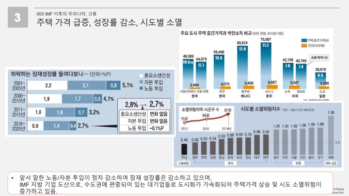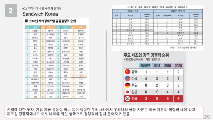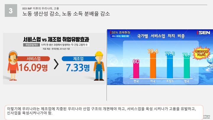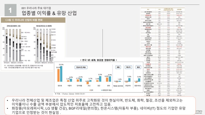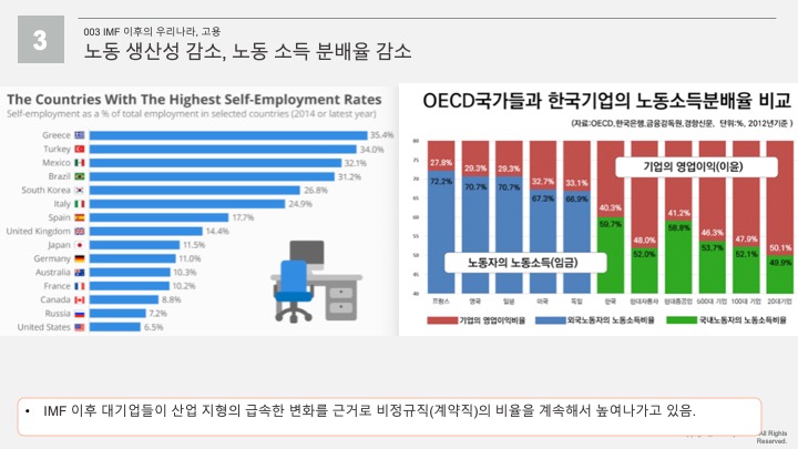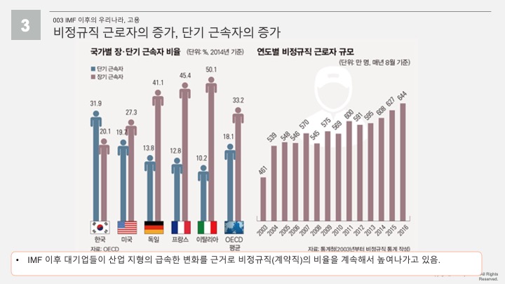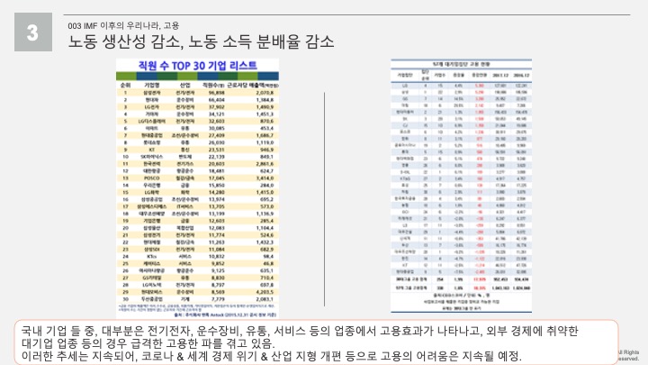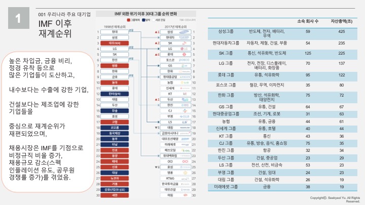 IMF 이후 많은 기업들이 도산하고, 결국 내수보다는 수출에 강한 기업, 제조업에 강한 대기업 업종 별로 재편되고 있고,
