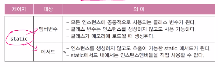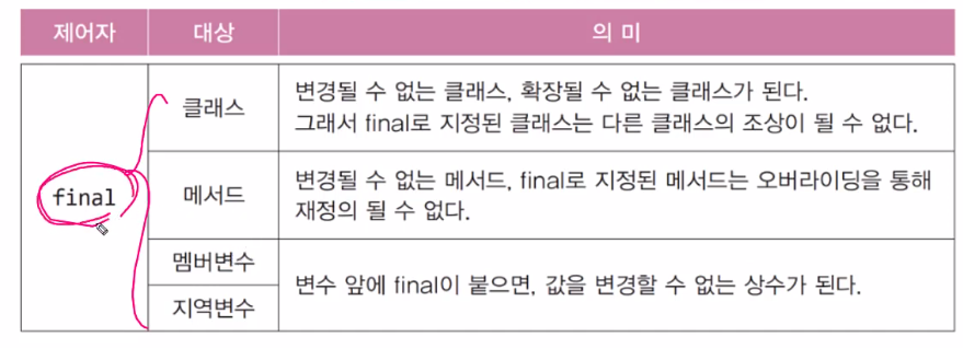 - 하나의 대상에 여러 제어자를 같이 사용 가능( 접근 제어자는 하나만)