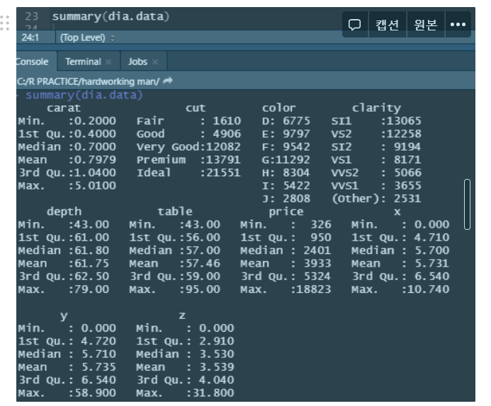 - summary(): 요약값 , 수치형변수: 최대값, 최소값, 평균, 사분위수