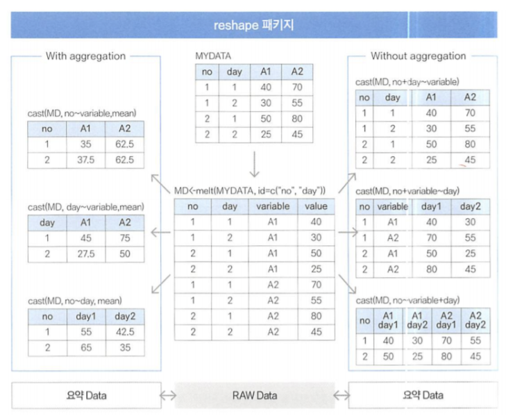 reshape 패키지는 melt(), cast()라는 핵심 함수가 들어있다.