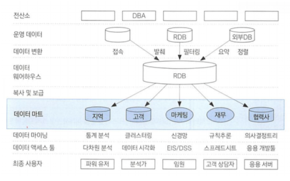 - 데이터 웨어하우스와 사용자 사이의 중간층에 위치 한 것으로, 하나의 주제 또는 부서 중심의 데이터 웨어하우스라고 할 수 있다.