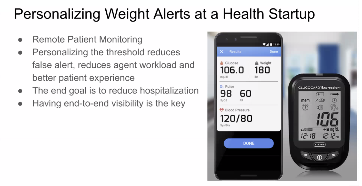 → 오른쪽 앱을 제공하고 3가지 센서(체중계, 혈압, sp, 당뇨) → 모바일 폰으로 블루투스 연결됨. → 일주일에 두세번만 측정하고 → 서버로 넘겨오면 알고리즘 넘어와서 → 지금, 과거 데이터 기반으로 알람 뜨게 할지