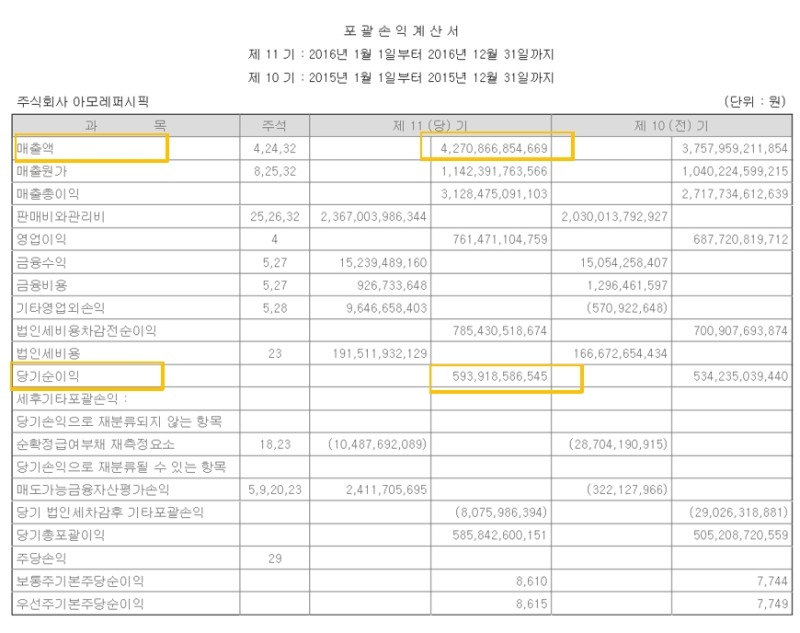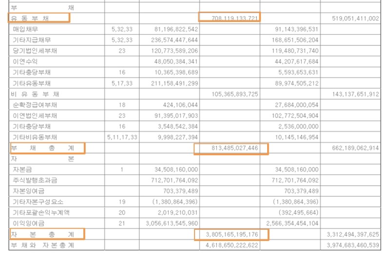 보통 매출이 증가하면 매출총이익률도 증가하는데 반대로 감소하는 경우는 원재료의 가격 상승이나 매출 증가를 위한 홍보비 증가 등이 주된 이유로 거론됩니다. 이 또한 계정과목 옆에 기재된 주석번호를 쫓아가 주석사항을 찾아보면 전년대비 비용이 많이 증가한 계정을 찾으실 수 있습니다.