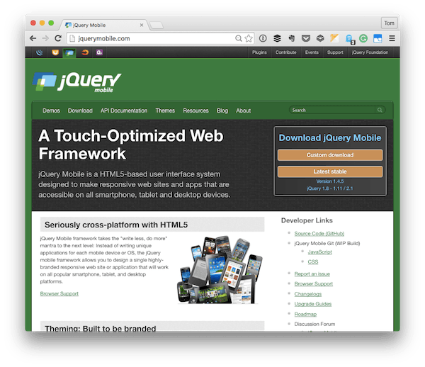 jQuery Mobile은 jQuery UI와 매우 비슷하게 잘 문서화된 API와 사용자 정의 테마를 제공함으로써 프로젝트가 목표로 하는 다양한 장치에 이상적입니다.