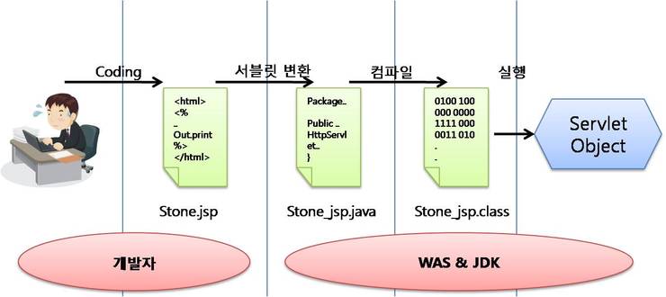 서블릿은 자바 소스코드 속에 HTML코드가 들어가는 형태인데, JSP는 이와 반대로 HTML 소스코드 속에 자바 소스코드가 들어가는 구조를 갖는 웹어플리케이션 프로그래밍 기술입니다. HTML속에서 자바코드는 <% 소스코드 %> 또는 <%= 소스코드 =%>형태로 들어갑니다. 자바 소스코드로 작성된 이 부분은 웹 브라우저로 보내는 것이아니라 웹 서버에서 실행되는 부분입니다. 웹 프로그래머가 소스코드를 수정 할 경우에도 디자인 부분을 제외하고 자바 소스코드만 수정하면 되기에 효율을 높여줍니다. 또한 컴파일과 같은 과정을 할 필요없이 JSP페이지를 작성하여웹 서버의 디렉토리에 추가만 하면 사용이 가능합니다. 서블릿 규칙은 꽤나 복집하기 때문에 JSP가 나오게 되었는데 JSP는 WAS(Web Application Server)에 의하여 서블릿 클래스로 변환하여 사용되어 집니다.