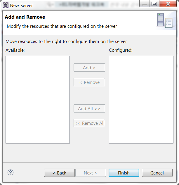 아직 웹 프로젝트를 만들지 않았으므로 양쪽 모두 공백 화면입니다. Finish 버튼을 클릭해서 등록을 완료합니다