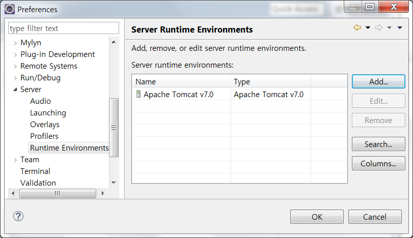 설정을 완료하면 조금전 열었던 Server Runtime Environments의 화면에 톰캣 서버가 등록된 것을 확인할 수 있습니다.