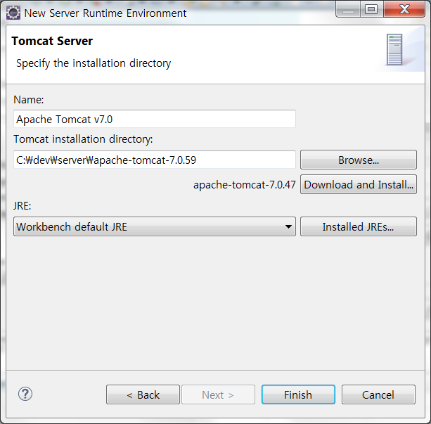 Tomcat installation directory: 부분에 톰캣이 설치된 경로 설정