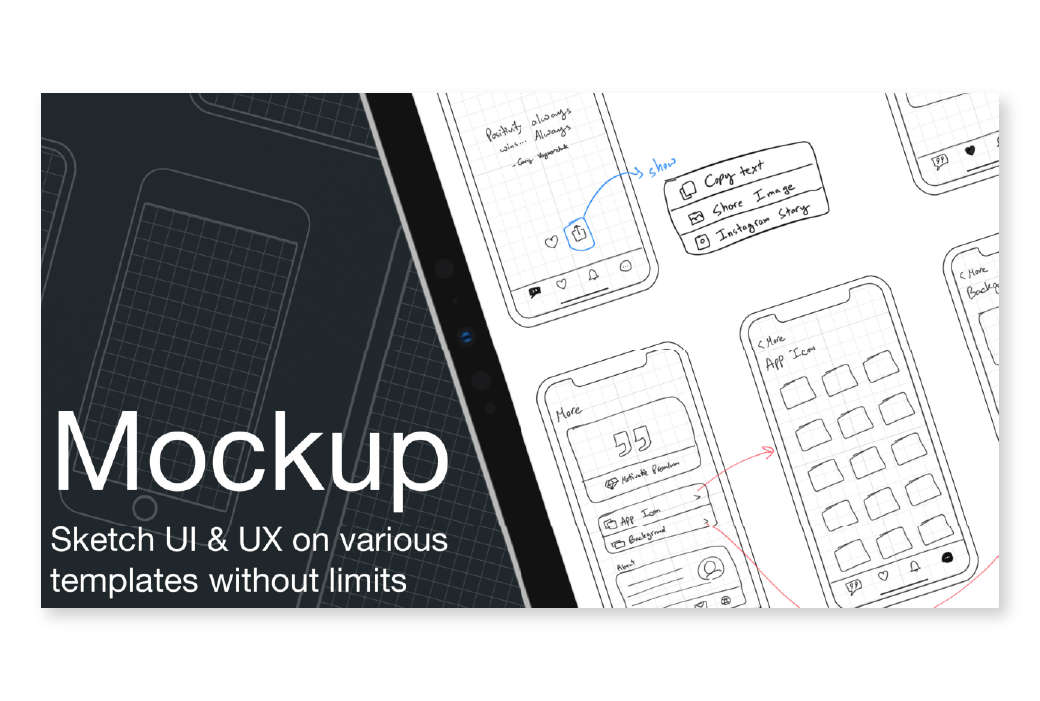 Mockup - Sketch UI & UX는 제가 우연히 광고를 보고 알게 된 서비스인데요. 우선 무료로 이용이 가능하다는 점이 마음에 들었고, 기기 사이즈 별로 다양한 목업을 제공해주기 때문에 그에 맞춰 스케치를 슥슥 하기만 하면 와이어프레임이 어느 정도 완성이 된다는 점이 편리했습니다. 이를 잘 그렸을 경우에는 기획서에 넣어도 좋지만, 디자인 작업에 들어가기 전에 개발자들에게 기능에 대해 설명하며 보여주기에 아주 좋다고 생각합니다! 태블릿이나 애플 펜슬이 따로 없어도, 스마트폰에서 터치로 그릴 수 있다는 점 역시 좋은 것 같습니다.