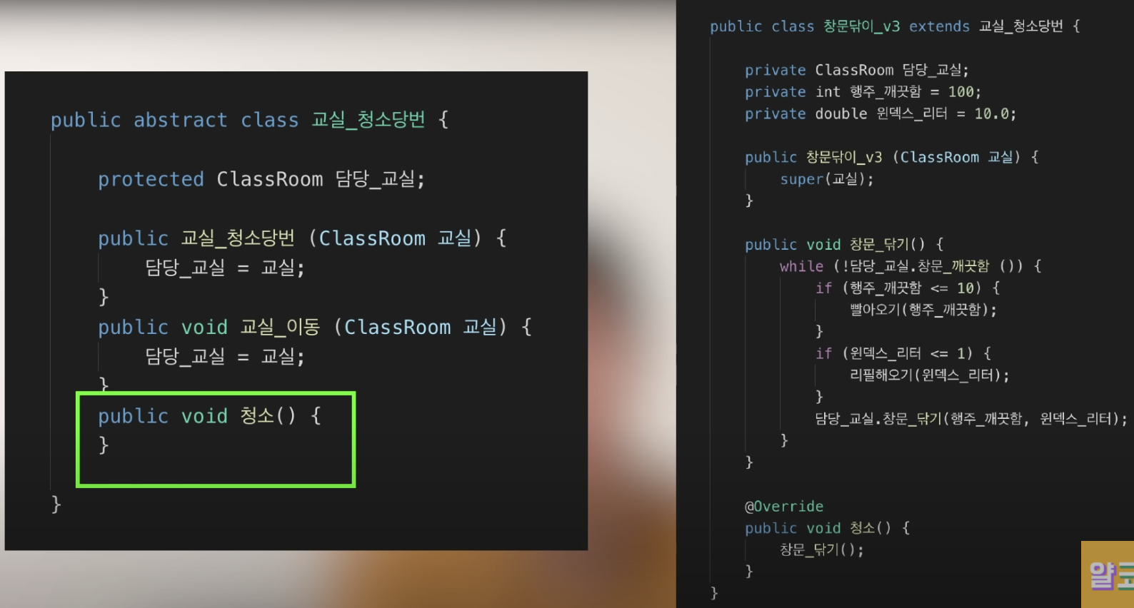 교실 청소당번은 모호함 그래서 abstrcat 라고 지정하며(객체 불가능) 이자체는 이를 상속한 자식클래스로만 객체가 생성됨을 알수 있음.