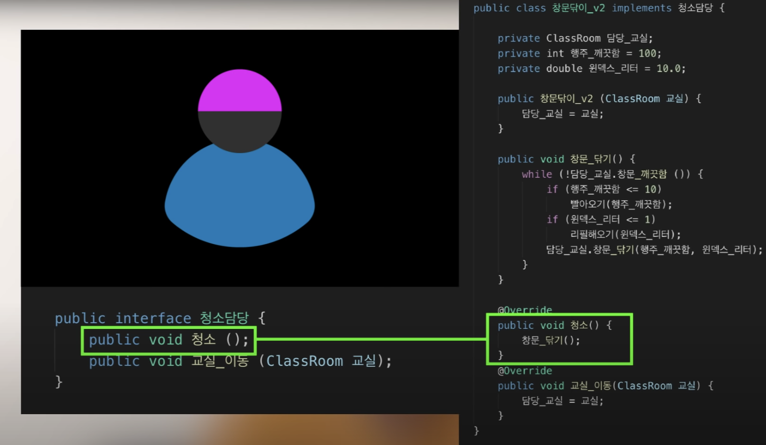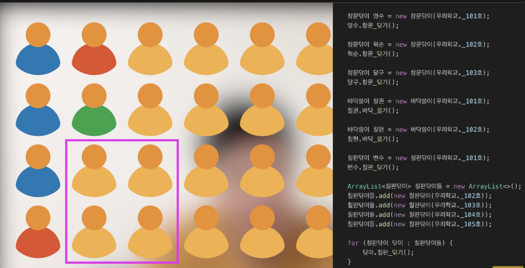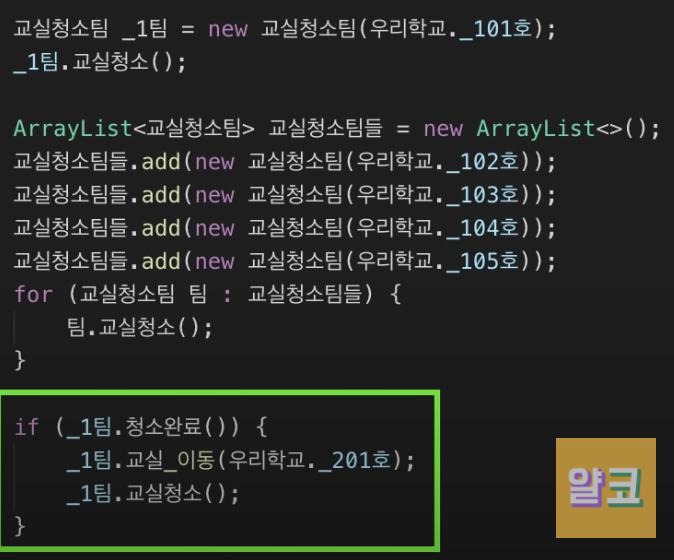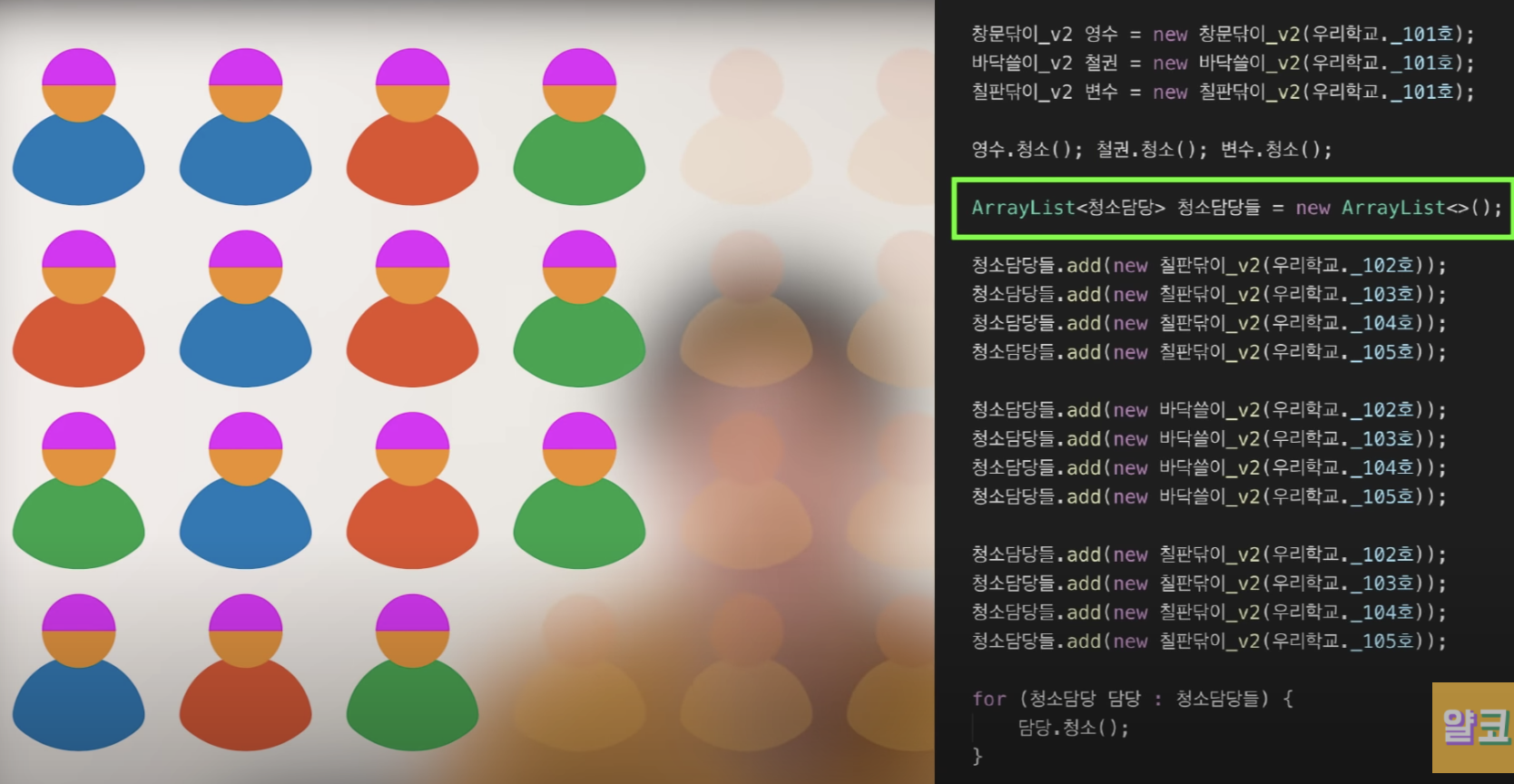 동일한 청소라는 메소드로 모두에게 일을 시킬수가 있게되며, 어레이 리스트를 통해서 한번에 지정도 가능하다!