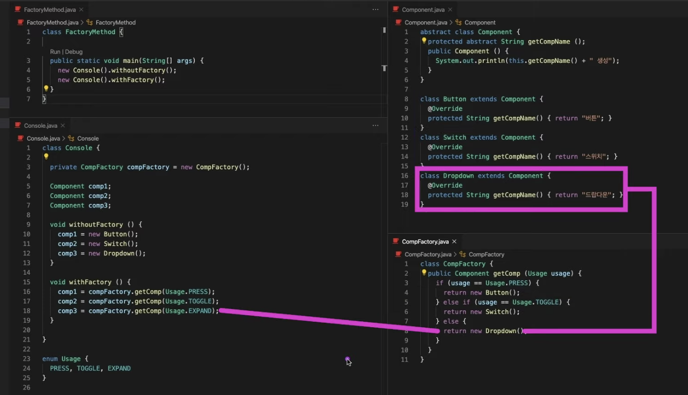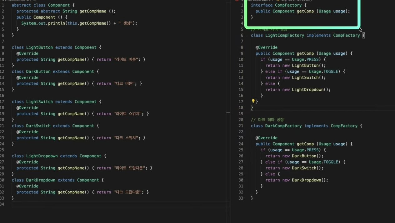 Abstract-factory -> 테마마다 팩토리 설정 가능함