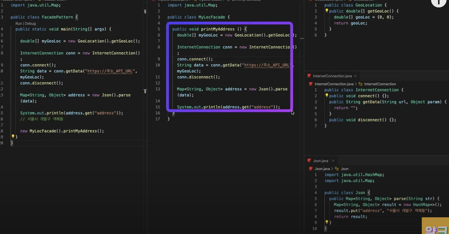 여러 클래스의 작업을 Facade라는 외벽으로 막아서 수행하는 것을 뜻함.