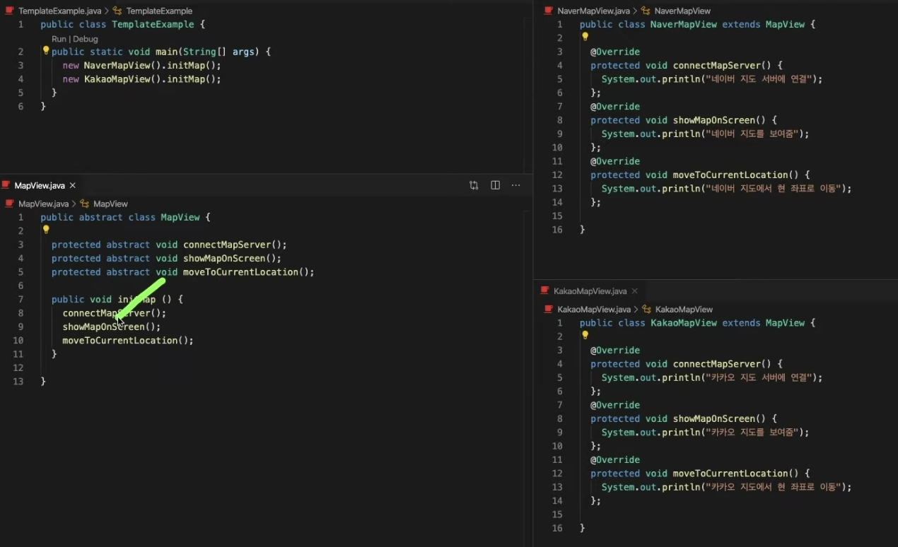 템플릿 메소드 패턴에서는 각각 오버라이딩하는 것으로 보면 된다.