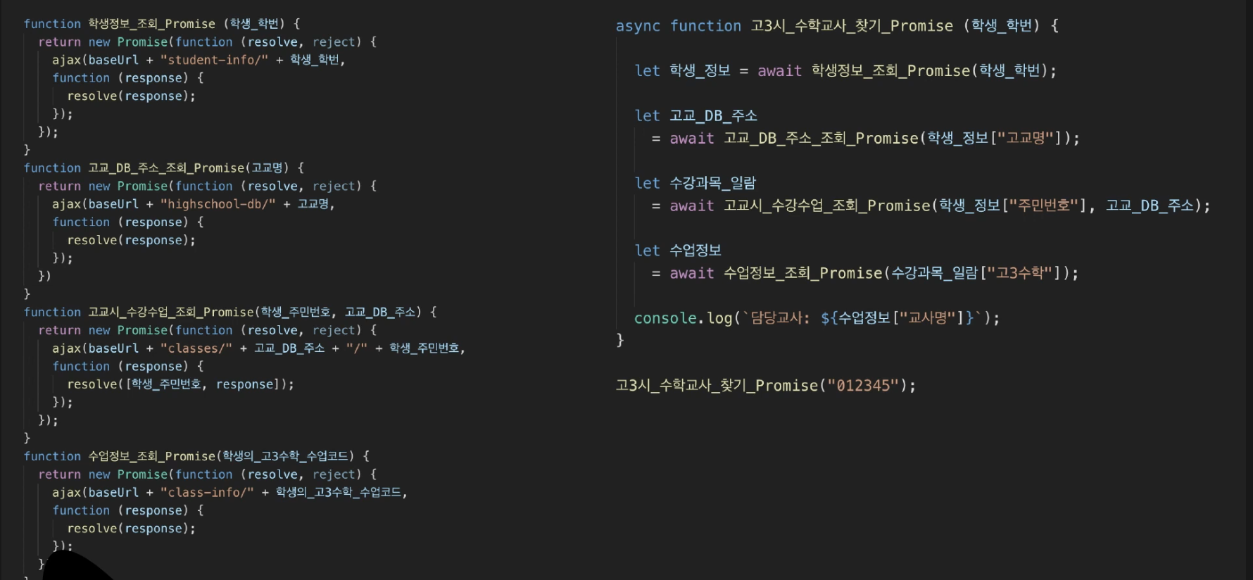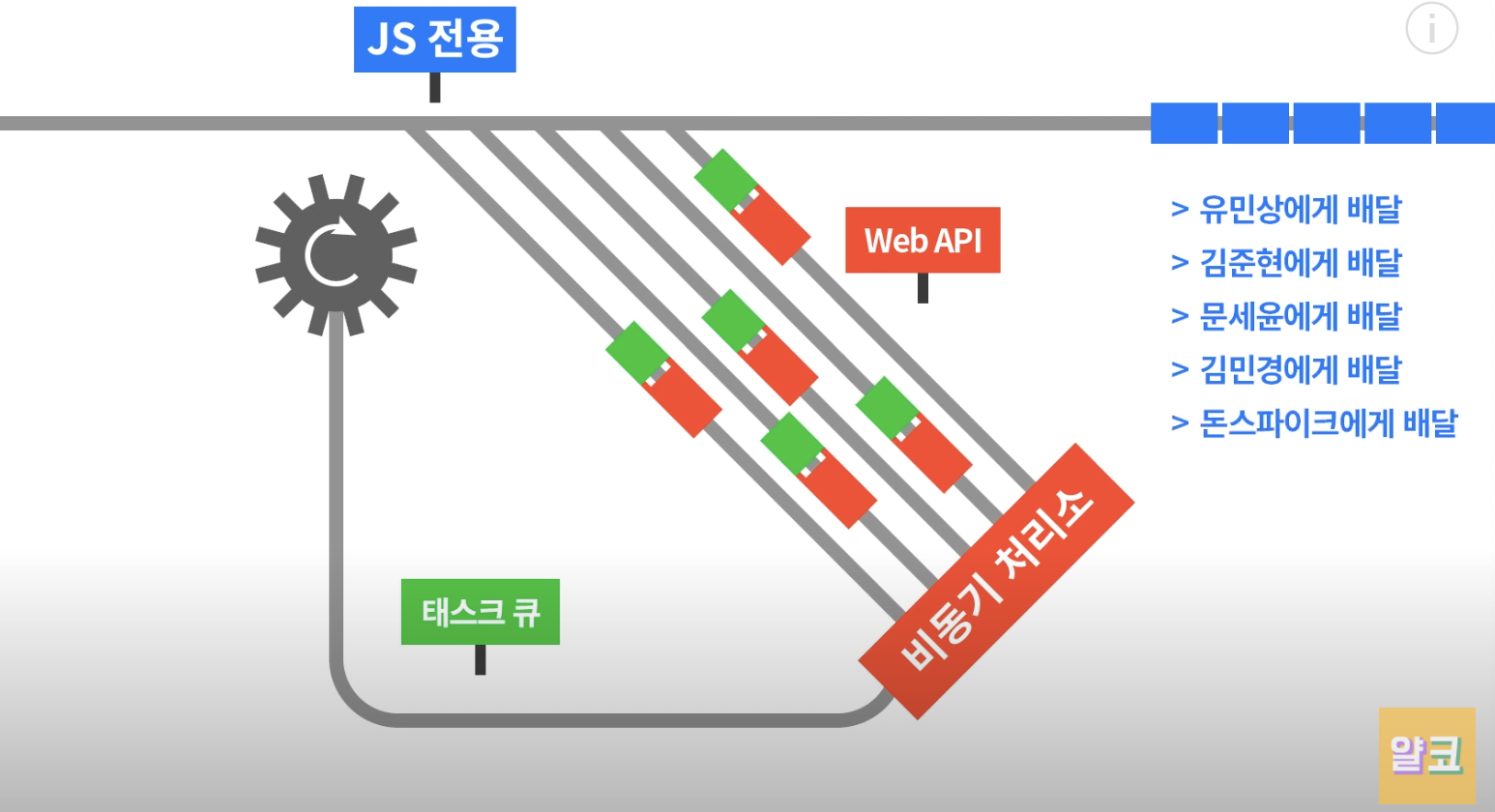 비동기 처리 끝나는대로 테스크 큐에 의해서 콜백함수가 호출된다.