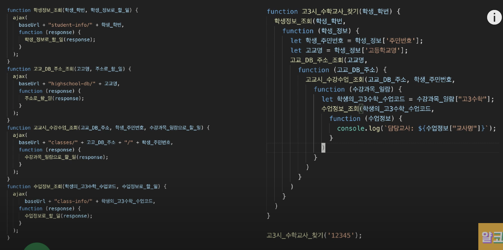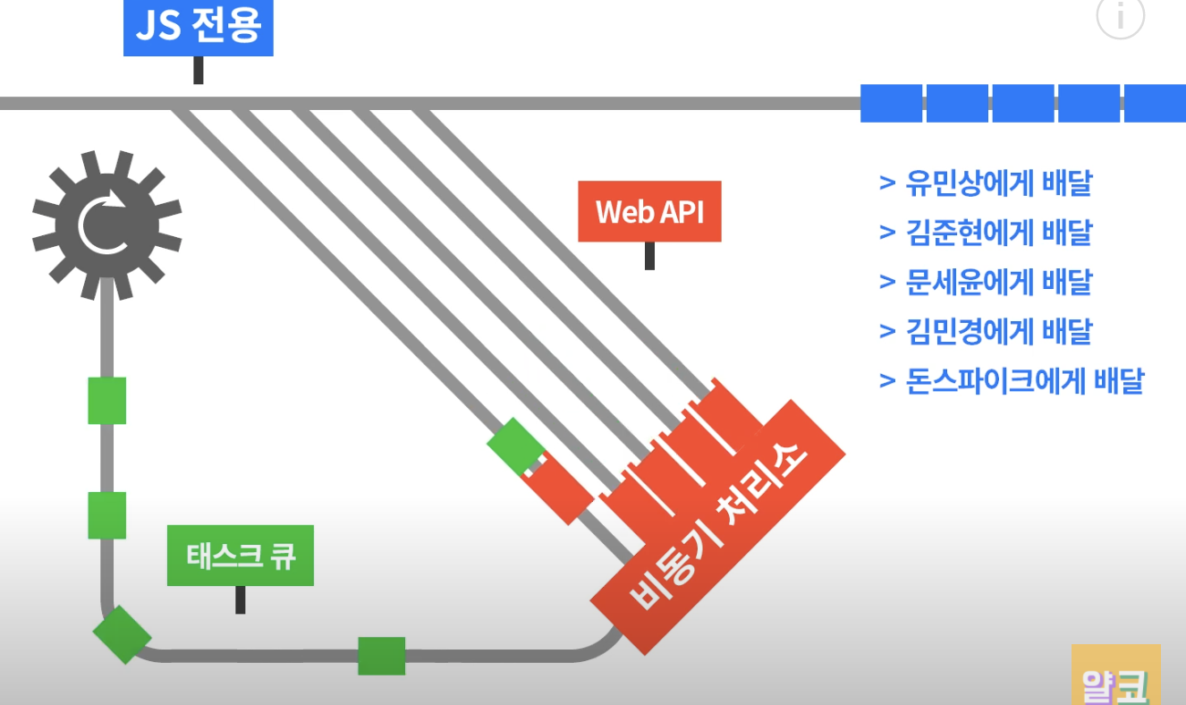 비동기 처리 끝나는대로 테스크 큐에 의해서 콜백함수가 호출된다.