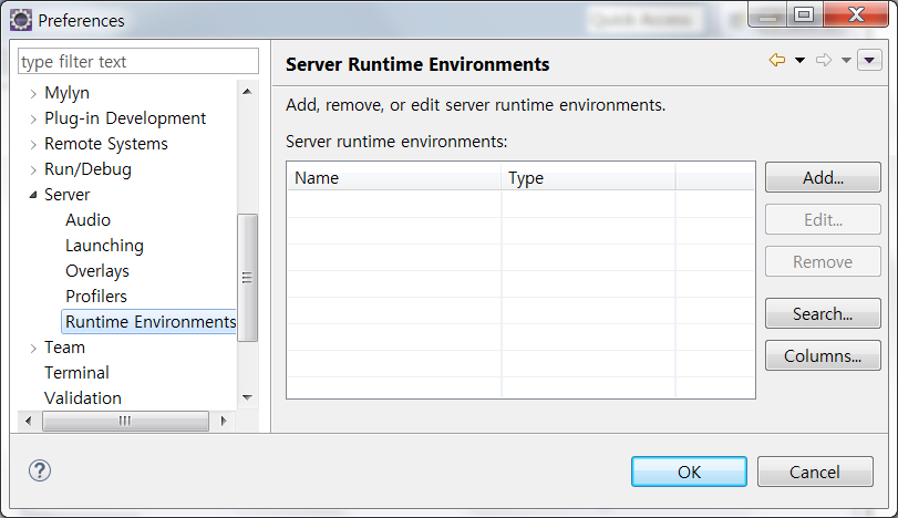 설정을 완료하면 조금전 열었던 Server Runtime Environments의 화면에 톰캣 서버가 등록된 것을 확인할 수 있습니다.