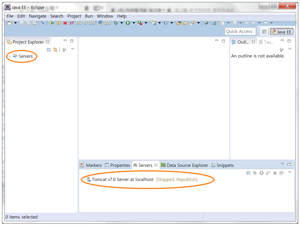 Project Explorer 뷰에서 보면, Servers 폴더를 클릭하면 Servers 프로젝트 아래에 톰캣 실행 환경 이름으로 폴더가 생성되어 있습니다.
