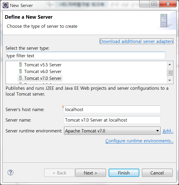 서버 등록창에서 Apache Tomcat v7.0 노드를 선택한 뒤 Next 버튼을 클릭합니다.