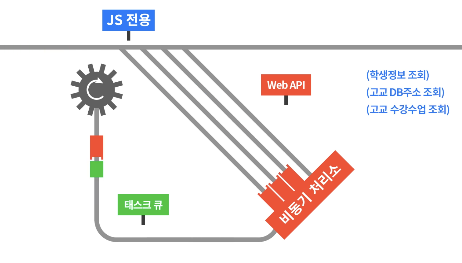 비동기 처리 끝나는대로 테스크 큐에 의해서 콜백함수가 호출된다.